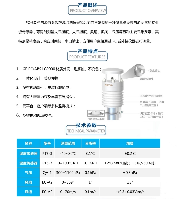 PC-8D型氣象五參數環境監測儀是我公司自主研制的一種測量多要素氣象要素的傳感器,可同時測量大氣溫度、大氣濕度、風速、風向、氣壓等五種主要氣象要素。其特點是精度高,響應時間快,串口輸出,方便用戶直接通過PC或外接儀器進行測量。